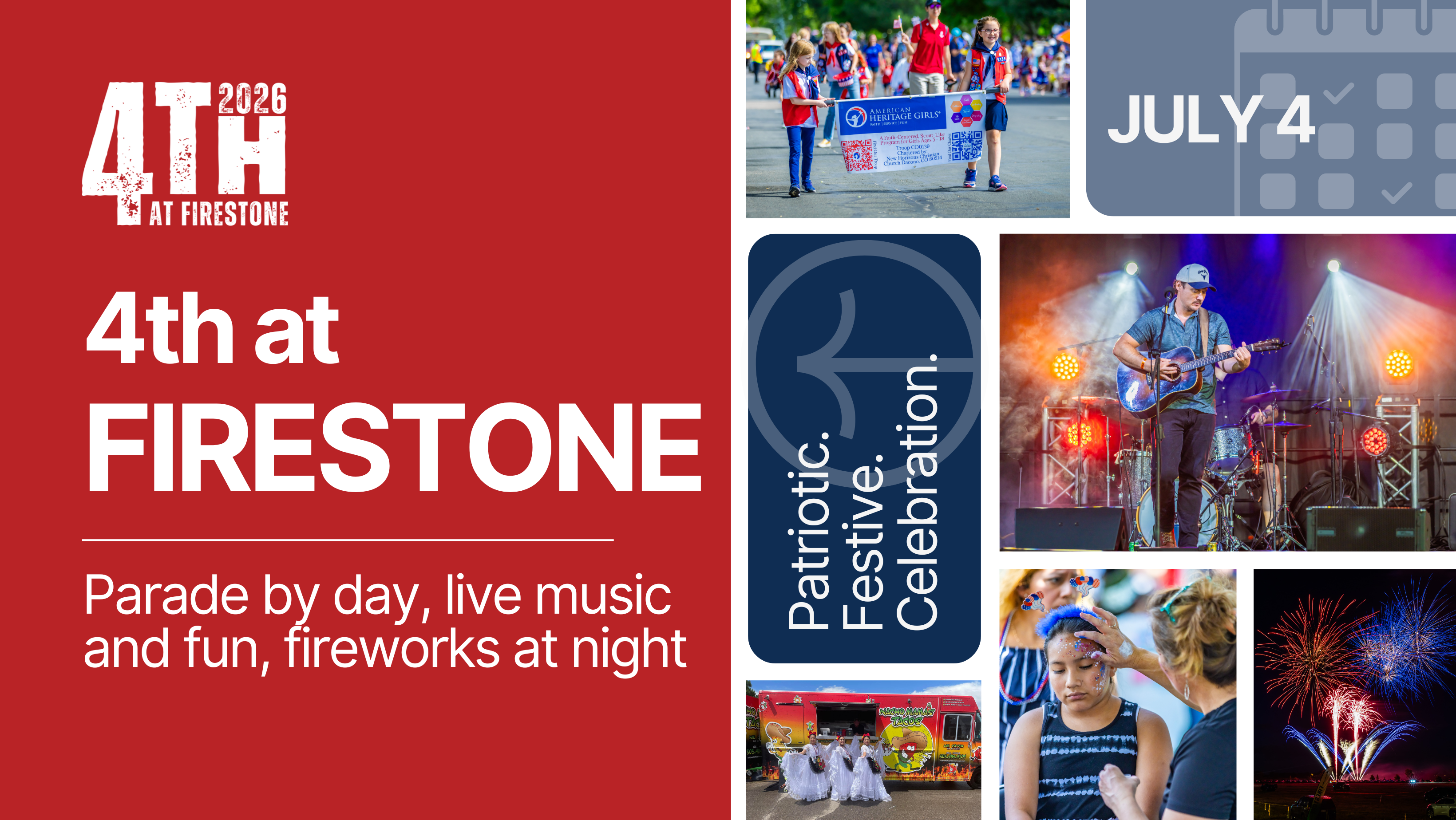 Join us for a full day of patriotic fun for the whole family! Kick off the festivities with a lively parade through Historic Firestone, then head to the park for a bustling street fair packed with free games, crafts, and hands-on activities. Enjoy delicious eats from food trucks, browse unique vendors, and soak in live entertainment and a festive beer garden. As night falls, the celebration reaches its peak with a spectacular fireworks show lighting up the sky. Don’t miss this unforgettable day of community, fun, and celebration!