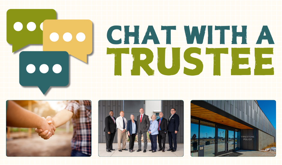 Firestone Residents & Business Owners are invited to join your elected officials for an upcoming Chat with a Trustee event. These events provide a great opportunity to speak with Firestone’s elected officials, ask questions, and discuss issues or concerns related to the Town of Firestone. There will not be a formal presentation, so join us to chat whenever you can.